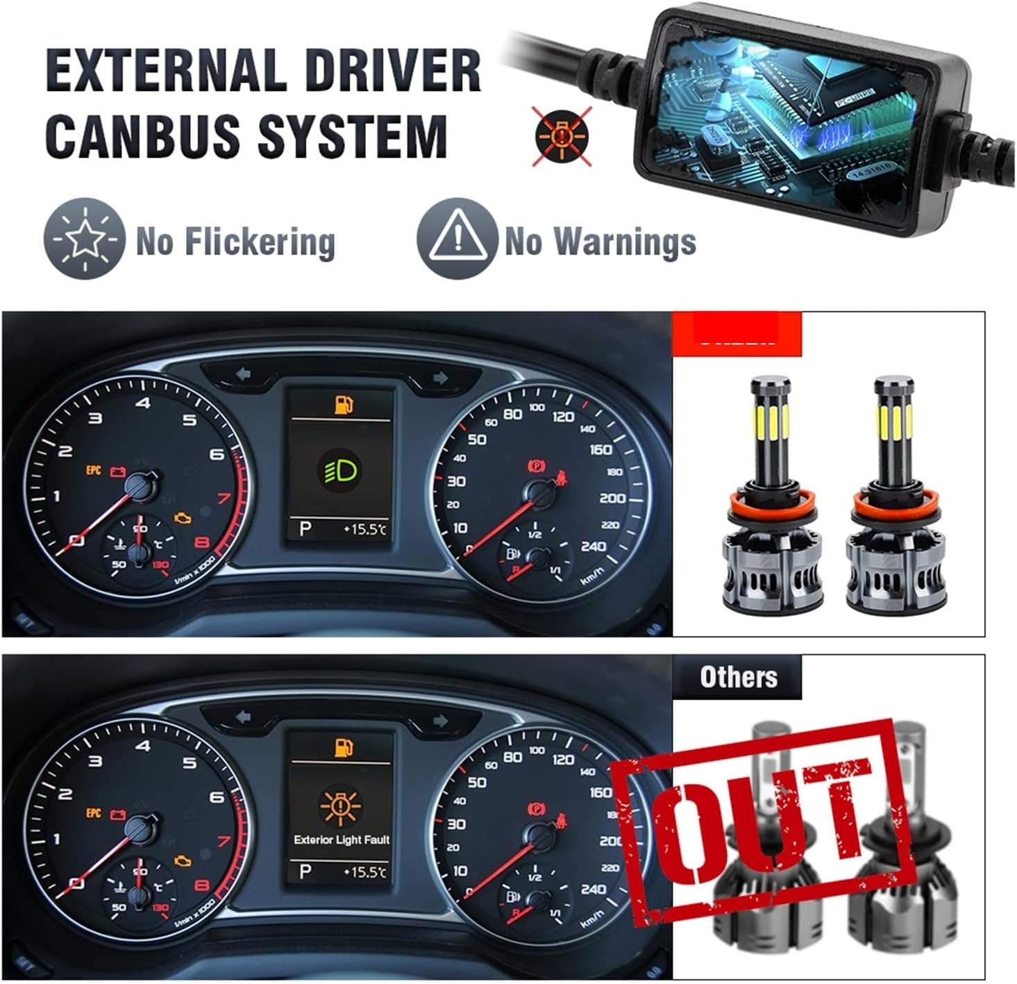 - توافق ذكي (CANbus Ready): متوافق مع نظام السيارة الإلكتروني لمنع الوميض أو ظهور رسائل الخطأ في لوحة القيادة لـ 95% من السيارات الحديثة.